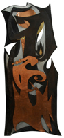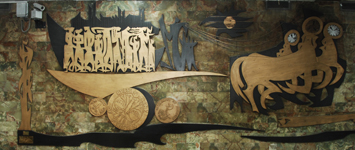 A distinctive feature of Sadequain’s artwork in the State Bank of Pakistan is the collection of collages, worked in wood and metal. He did it exclusively for the Bank. This kind of work by him is nowhere else to be seen. On the background of wooden frames, Sadequain worked miracles twisting iron, copper and steel into artist’s fertile imagination of figures of hope, aspiration and conquest. There are four of them done in mixed media of wood, copper, iron and steel and one done only in copper on wood.